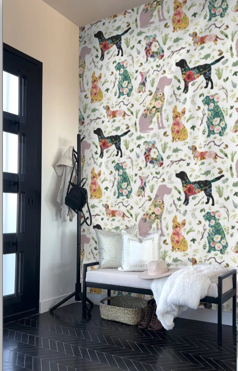 As you step into your home, search for a wall that can serve as a focal point and a convenient landing spot. Ideally, you’ll want a wall that’s long enough for a bench and for storing boots, purses, backpacks, jackets, umbrellas, and anything else you bring in and out of your home on a daily basis. This entryway allows you to make the transition while keeping your belongings organized and visually appealing. Once you’ve determined the right spot, define the space. Here are a few different ways to do this
