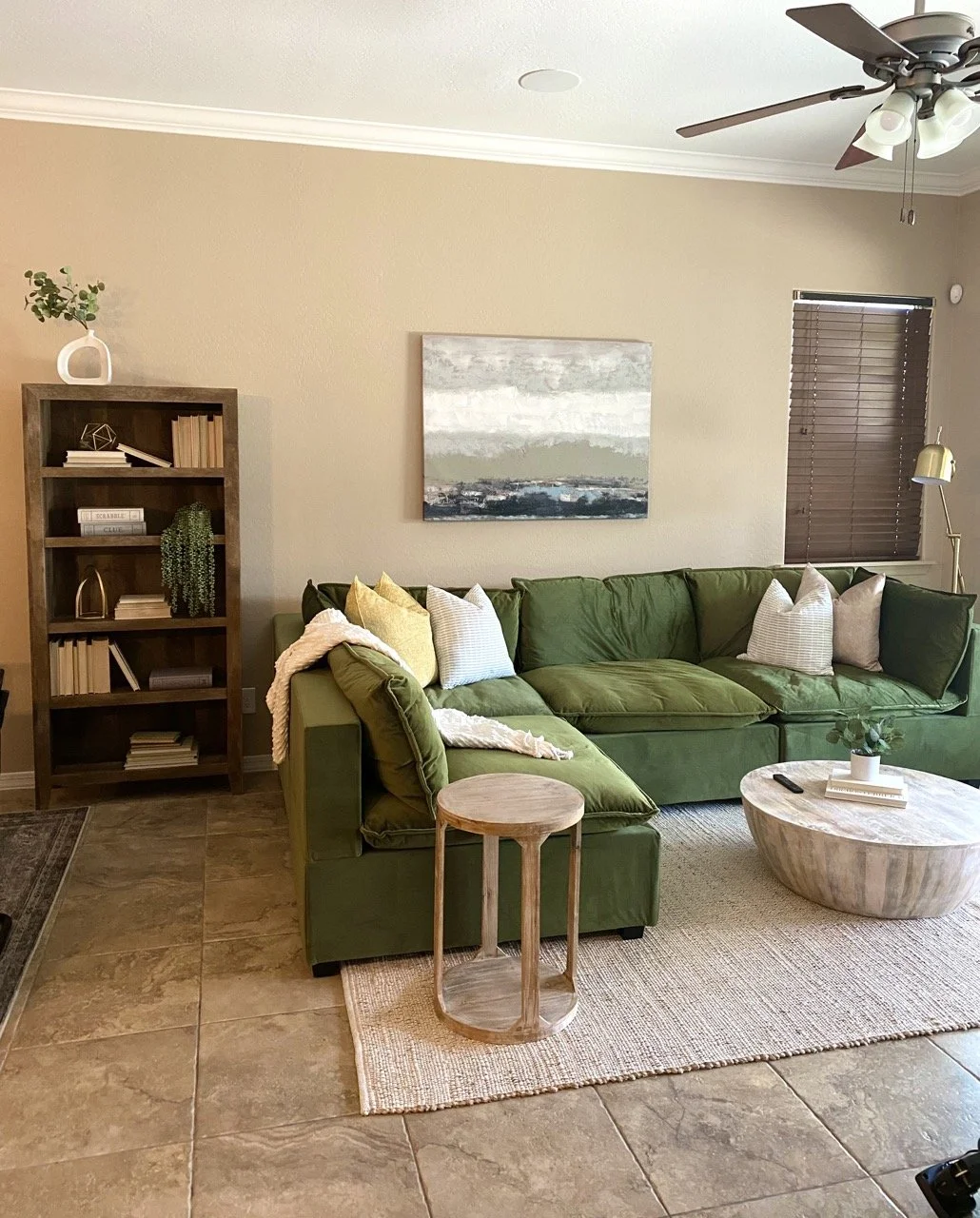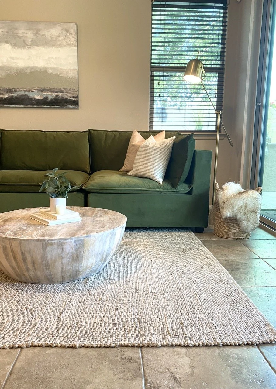Working title... I need blog topic for this room.I loved it being green. For a neutral color palette it was fun to have the one underlying accent (the natural greenery through out the house) to really show up in a big way in this living room. The client was a little hesitant to have any color in the home but didnt want it all beige and neutral. Since the expansive glass doors in the back of the house framed out a beautiful view of backyard (like a giant piece of art that you can see the minute you walk in the front door) it was a fun idea to bring the greenery of the yard and the mural into the living room to continue the indoor-outdoor feel. And then the moss/olive color became our subtle accent color and the underlying theme for this home.